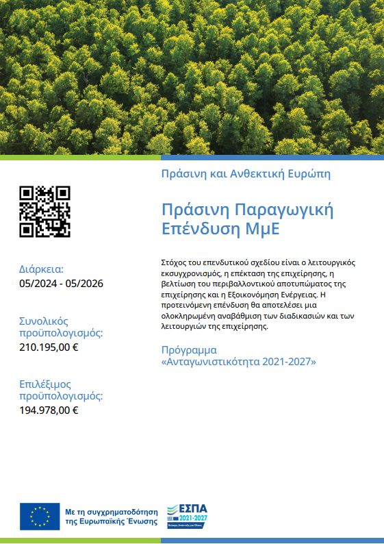 Η επιχείρηση χρηματοδοτήθηκε από τη Δράση του Προγράμματος «Ανταγωνιστικότητα» (ΕΣΠΑ 2021-2027) "Πράσινος Μετασχηματισμός" της Δέσμης Δράσεων "Πράσινη Μετάβαση ΜμΕ". Η Δράση στοχεύει στην αξιοποίηση και ανάπτυξη συγχρόνων τεχνολογιών από τις ΜμΕ, στην αναβάθμιση των παραγόμενων προϊόντων υπηρεσιών και εν γένει δραστηριοτήτων τους.